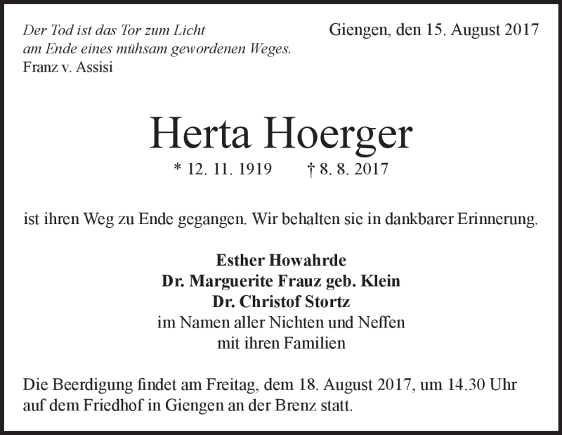 Hier finden Sie alle Traueranzeigen aus der Zeitung, die bisher für Herta Hoerger erschienen sind. Weitere Traueranzeigen, die in der Zeitung erscheinen, werden hier ebenfalls aufgelistet