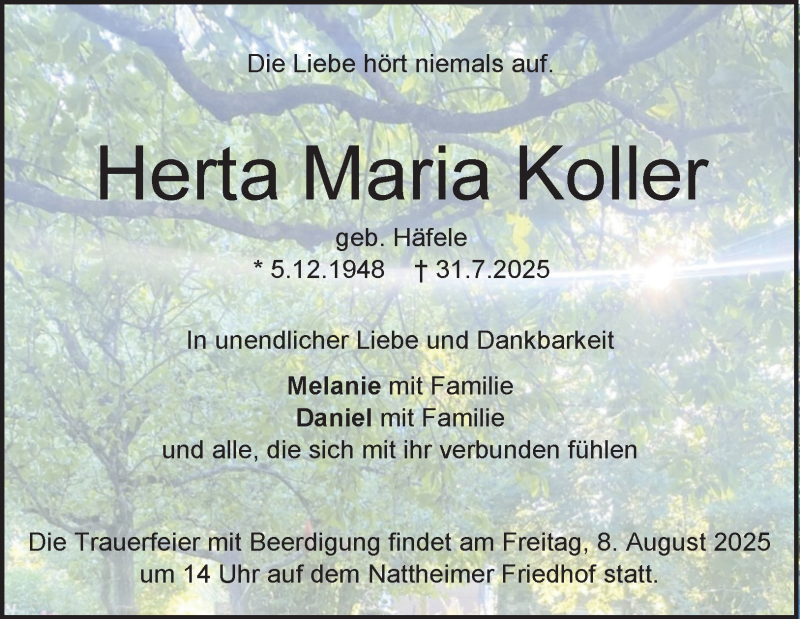 Hier finden Sie alle Traueranzeigen aus der Zeitung, die bisher für Herta Maria Koller erschienen sind. Weitere Traueranzeigen, die in der Zeitung erscheinen, werden hier ebenfalls aufgelistet
