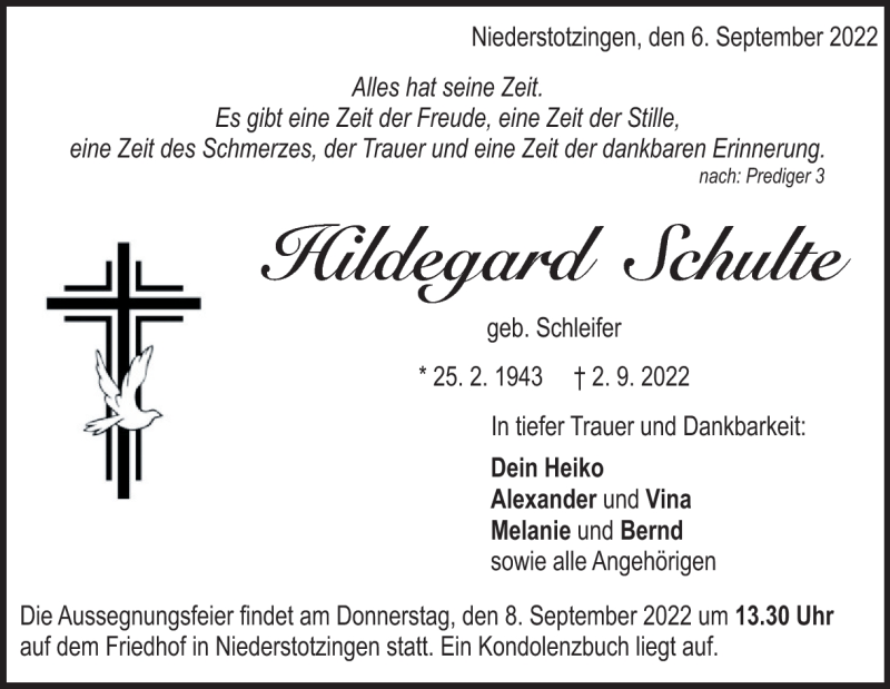 Hier finden Sie alle Traueranzeigen aus der Zeitung, die bisher für Hildegard Schulte erschienen sind. Weitere Traueranzeigen, die in der Zeitung erscheinen, werden hier ebenfalls aufgelistet