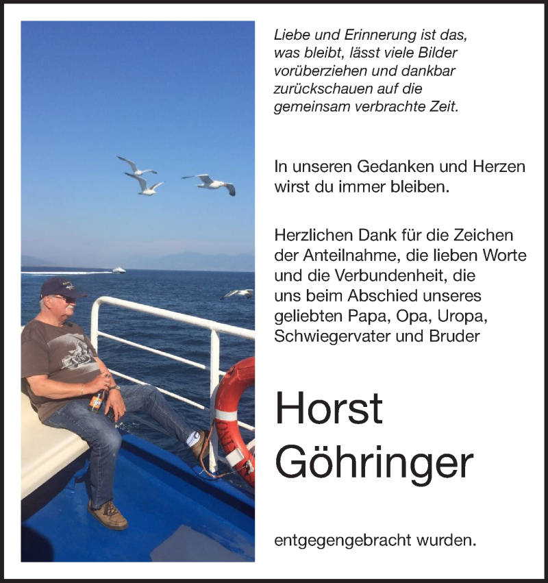 Hier finden Sie alle Traueranzeigen aus der Zeitung, die bisher für Horst Göhringer erschienen sind. Weitere Traueranzeigen, die in der Zeitung erscheinen, werden hier ebenfalls aufgelistet