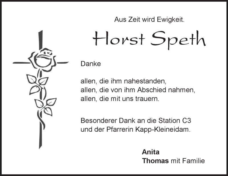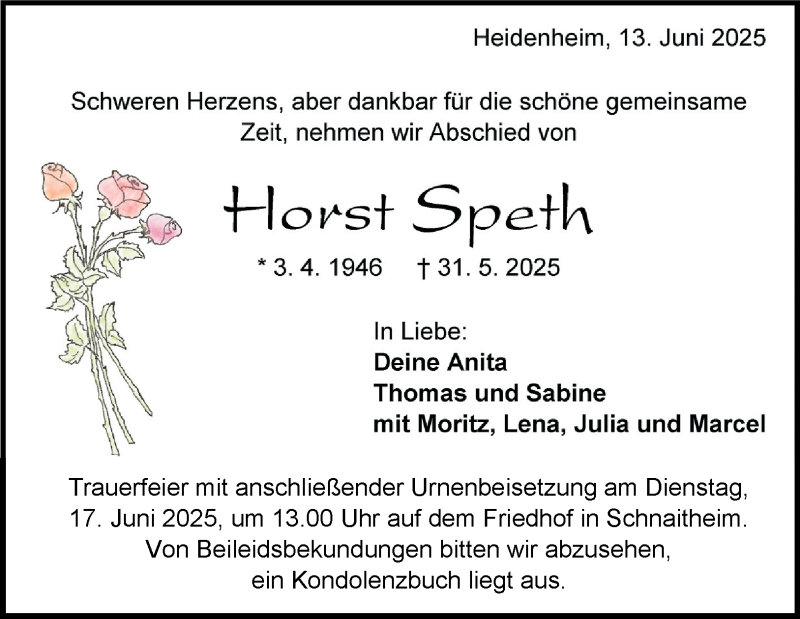Hier finden Sie alle Traueranzeigen aus der Zeitung, die bisher für Horst Speth erschienen sind. Weitere Traueranzeigen, die in der Zeitung erscheinen, werden hier ebenfalls aufgelistet
