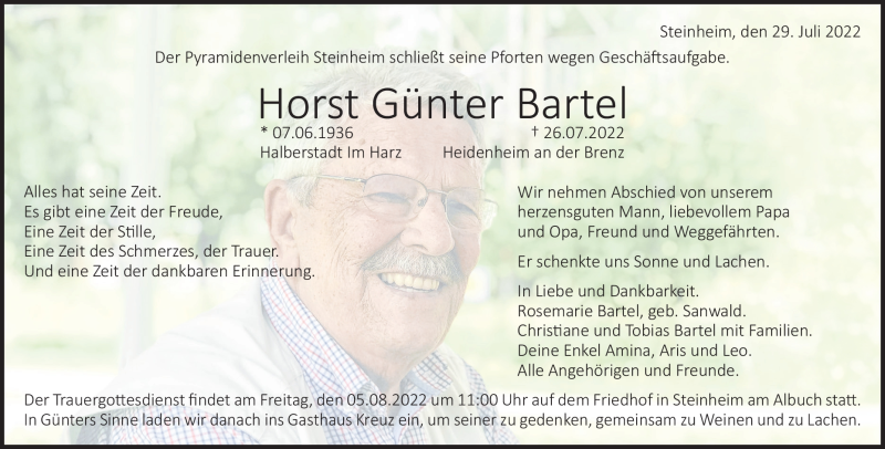Hier finden Sie alle Traueranzeigen aus der Zeitung, die bisher für Horst Günter Bartel erschienen sind. Weitere Traueranzeigen, die in der Zeitung erscheinen, werden hier ebenfalls aufgelistet