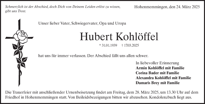 Hier finden Sie alle Traueranzeigen aus der Zeitung, die bisher für Hubert Kohlöffel erschienen sind. Weitere Traueranzeigen, die in der Zeitung erscheinen, werden hier ebenfalls aufgelistet