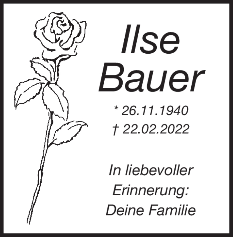 Hier finden Sie alle Traueranzeigen aus der Zeitung, die bisher für Ilse Bauer erschienen sind. Weitere Traueranzeigen, die in der Zeitung erscheinen, werden hier ebenfalls aufgelistet