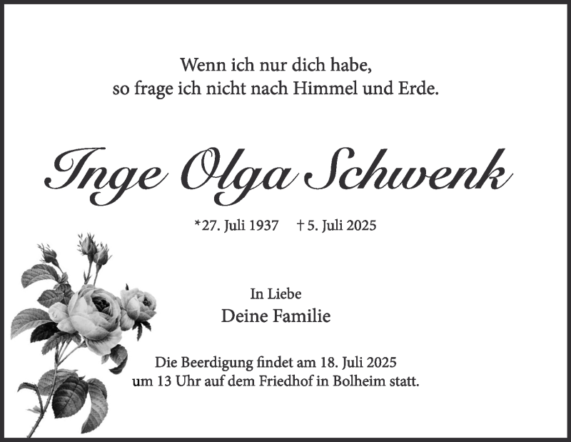 Hier finden Sie alle Traueranzeigen aus der Zeitung, die bisher für Inge Olga Schwenk erschienen sind. Weitere Traueranzeigen, die in der Zeitung erscheinen, werden hier ebenfalls aufgelistet
