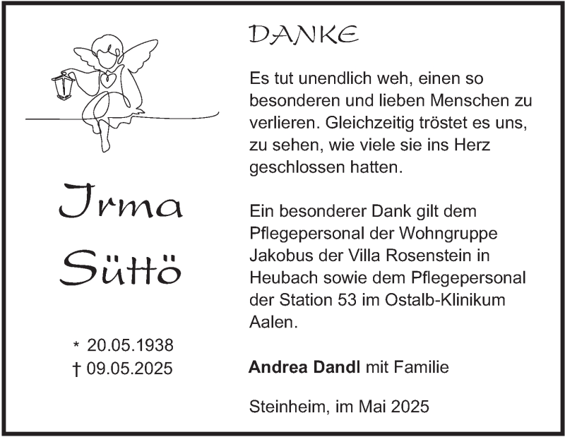 Hier finden Sie alle Traueranzeigen aus der Zeitung, die bisher für Irma Süttö erschienen sind. Weitere Traueranzeigen, die in der Zeitung erscheinen, werden hier ebenfalls aufgelistet