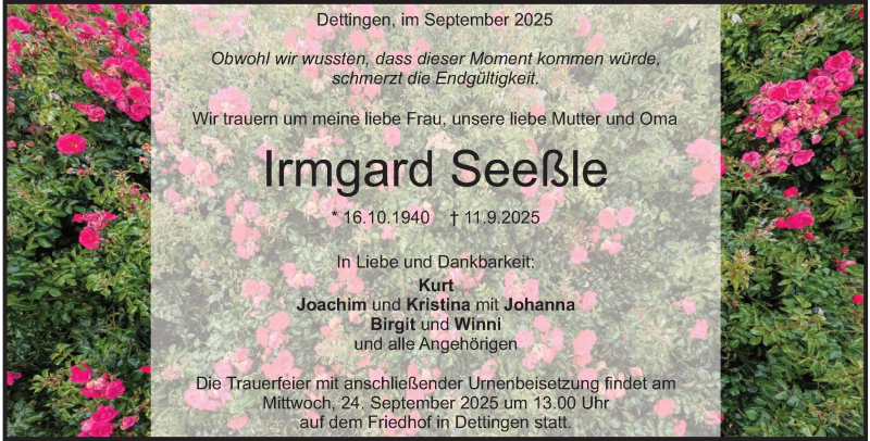Hier finden Sie alle Traueranzeigen aus der Zeitung, die bisher für Irmgard Seeßle erschienen sind. Weitere Traueranzeigen, die in der Zeitung erscheinen, werden hier ebenfalls aufgelistet