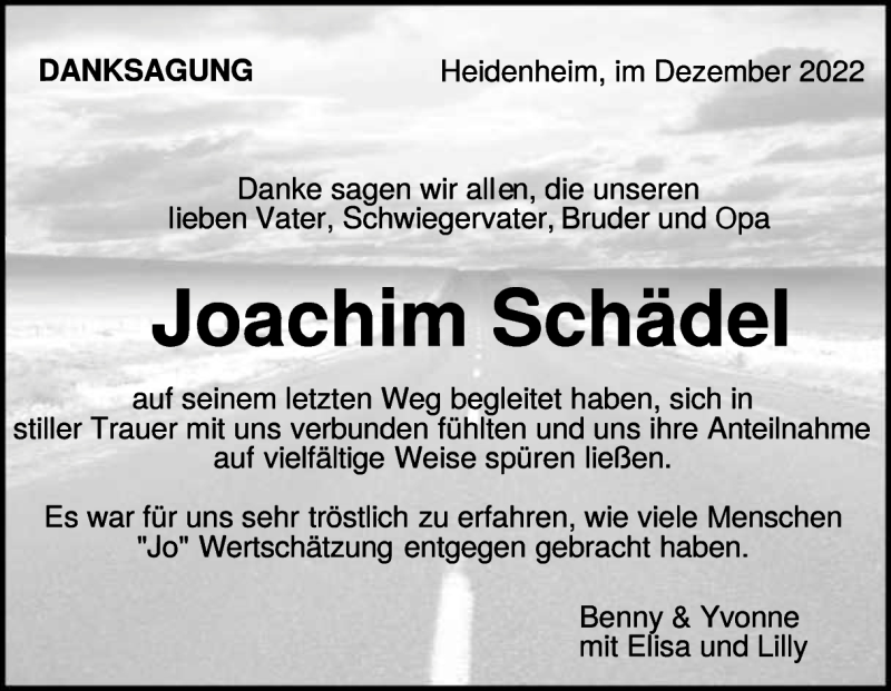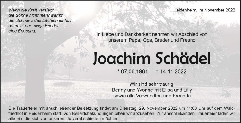 Hier finden Sie alle Traueranzeigen aus der Zeitung, die bisher für Joachim Schädel erschienen sind. Weitere Traueranzeigen, die in der Zeitung erscheinen, werden hier ebenfalls aufgelistet