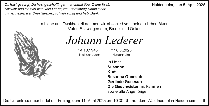 Hier finden Sie alle Traueranzeigen aus der Zeitung, die bisher für Johann Lederer erschienen sind. Weitere Traueranzeigen, die in der Zeitung erscheinen, werden hier ebenfalls aufgelistet
