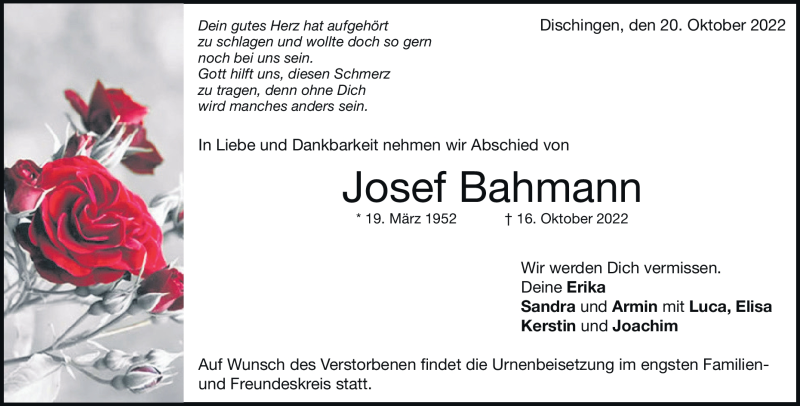 Hier finden Sie alle Traueranzeigen aus der Zeitung, die bisher für Josef Bahmann erschienen sind. Weitere Traueranzeigen, die in der Zeitung erscheinen, werden hier ebenfalls aufgelistet