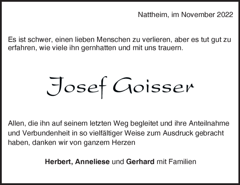 Hier finden Sie alle Traueranzeigen aus der Zeitung, die bisher für Josef Goisser erschienen sind. Weitere Traueranzeigen, die in der Zeitung erscheinen, werden hier ebenfalls aufgelistet