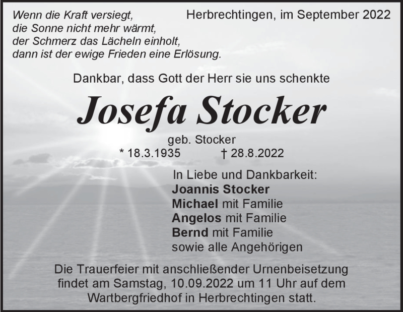 Hier finden Sie alle Traueranzeigen aus der Zeitung, die bisher für Josefa Stocker erschienen sind. Weitere Traueranzeigen, die in der Zeitung erscheinen, werden hier ebenfalls aufgelistet