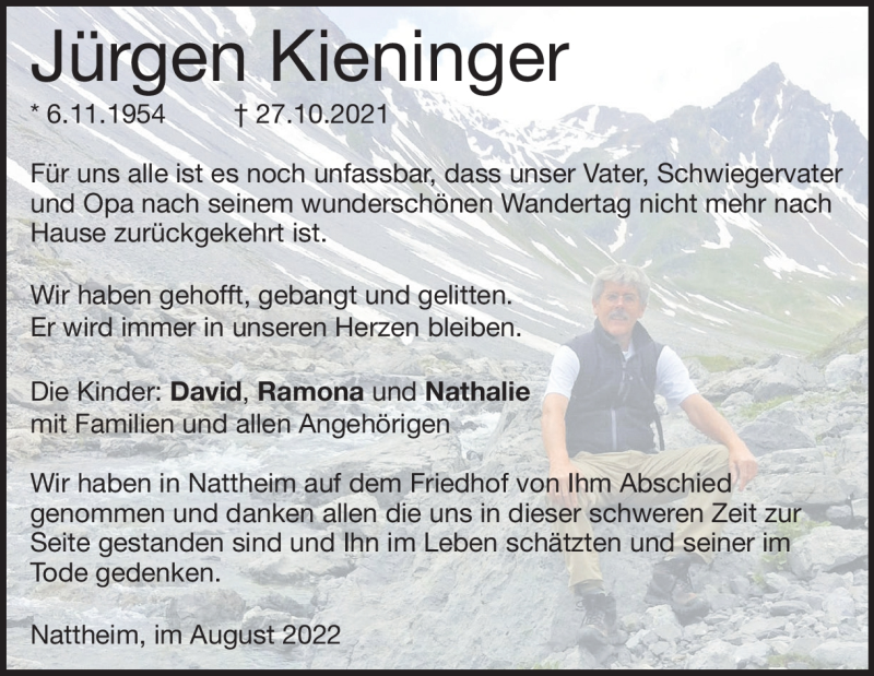 Hier finden Sie alle Traueranzeigen aus der Zeitung, die bisher für Jürgen Kieninger erschienen sind. Weitere Traueranzeigen, die in der Zeitung erscheinen, werden hier ebenfalls aufgelistet