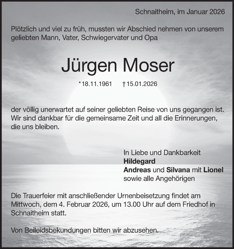 Hier finden Sie alle Traueranzeigen aus der Zeitung, die bisher für Jürgen Moser erschienen sind. Weitere Traueranzeigen, die in der Zeitung erscheinen, werden hier ebenfalls aufgelistet