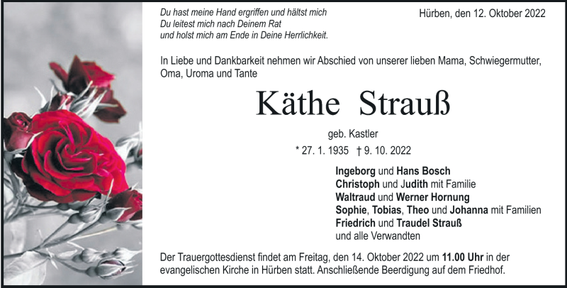 Hier finden Sie alle Traueranzeigen aus der Zeitung, die bisher für Käthe Strauß erschienen sind. Weitere Traueranzeigen, die in der Zeitung erscheinen, werden hier ebenfalls aufgelistet