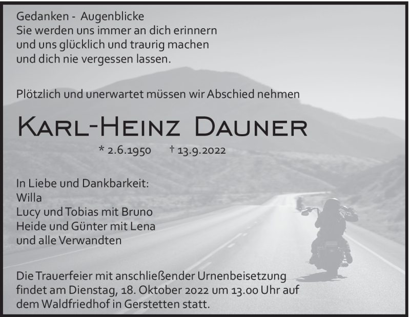 Hier finden Sie alle Traueranzeigen aus der Zeitung, die bisher für Karl-Heinz Dauner erschienen sind. Weitere Traueranzeigen, die in der Zeitung erscheinen, werden hier ebenfalls aufgelistet