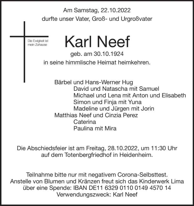 Hier finden Sie alle Traueranzeigen aus der Zeitung, die bisher für Karl Neef erschienen sind. Weitere Traueranzeigen, die in der Zeitung erscheinen, werden hier ebenfalls aufgelistet