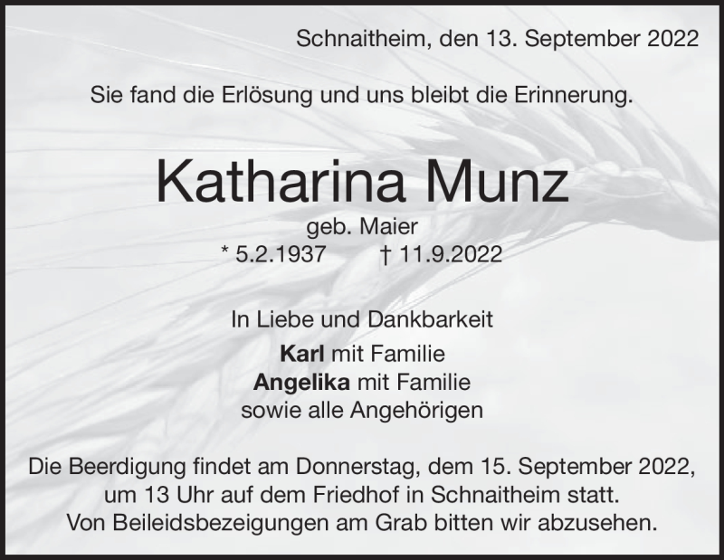 Hier finden Sie alle Traueranzeigen aus der Zeitung, die bisher für Katharina Munz erschienen sind. Weitere Traueranzeigen, die in der Zeitung erscheinen, werden hier ebenfalls aufgelistet