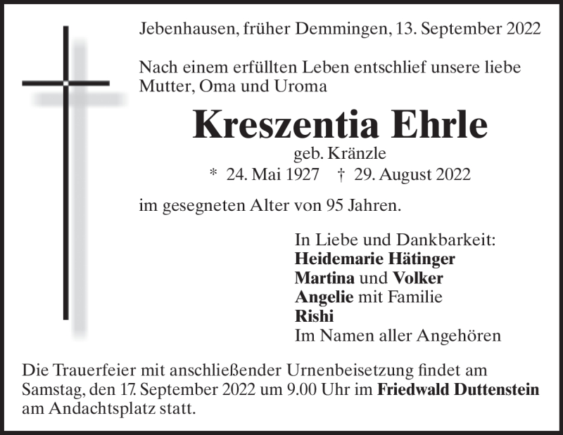 Hier finden Sie alle Traueranzeigen aus der Zeitung, die bisher für Kreszentina Ehrle erschienen sind. Weitere Traueranzeigen, die in der Zeitung erscheinen, werden hier ebenfalls aufgelistet