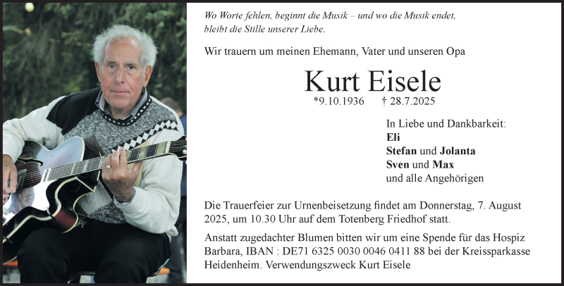 Hier finden Sie alle Traueranzeigen aus der Zeitung, die bisher für Kurt Eisele erschienen sind. Weitere Traueranzeigen, die in der Zeitung erscheinen, werden hier ebenfalls aufgelistet