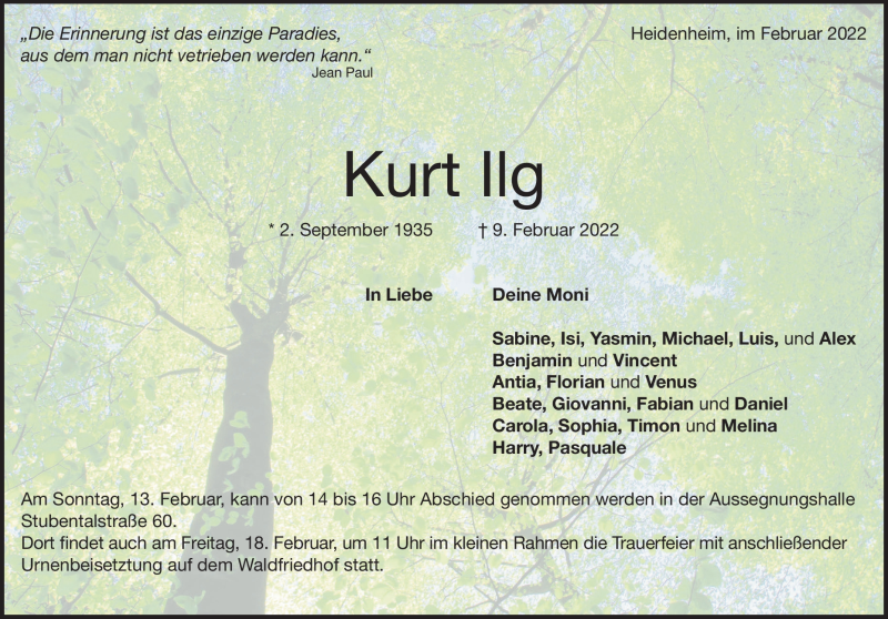 Hier finden Sie alle Traueranzeigen aus der Zeitung, die bisher für Kurt Ilg erschienen sind. Weitere Traueranzeigen, die in der Zeitung erscheinen, werden hier ebenfalls aufgelistet