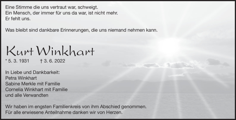 Hier finden Sie alle Traueranzeigen aus der Zeitung, die bisher für Kurt Winkhart erschienen sind. Weitere Traueranzeigen, die in der Zeitung erscheinen, werden hier ebenfalls aufgelistet