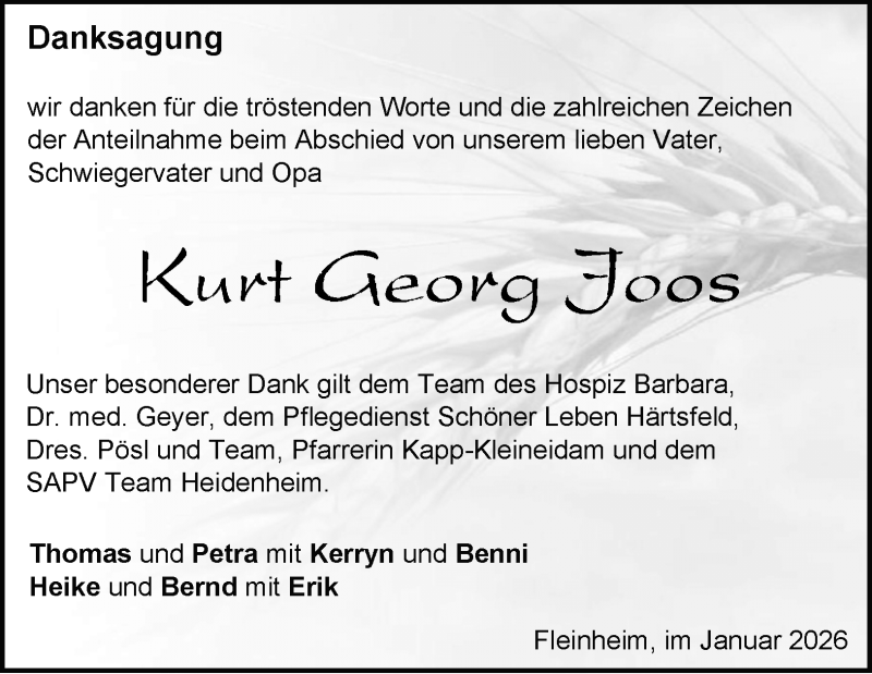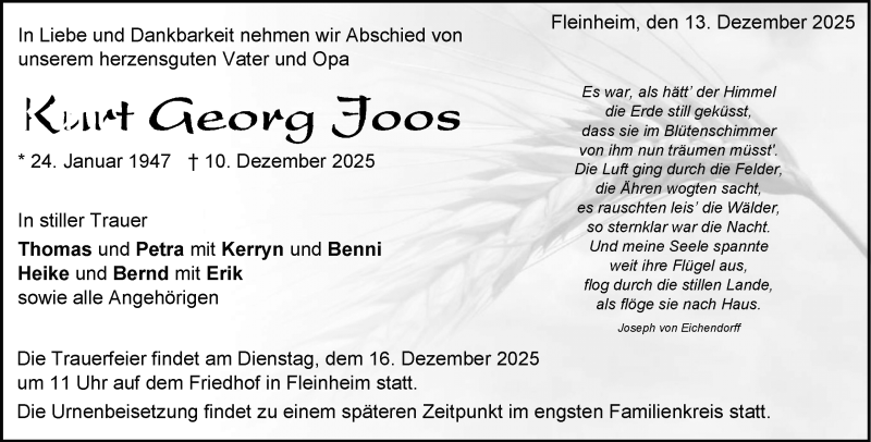 Hier finden Sie alle Traueranzeigen aus der Zeitung, die bisher für Kurt Georg Joos erschienen sind. Weitere Traueranzeigen, die in der Zeitung erscheinen, werden hier ebenfalls aufgelistet