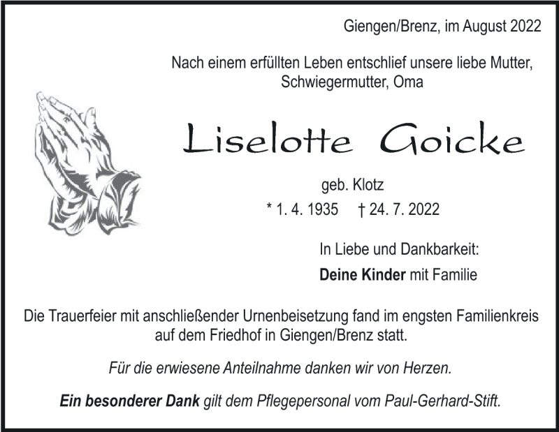 Hier finden Sie alle Traueranzeigen aus der Zeitung, die bisher für Liselotte Goicke erschienen sind. Weitere Traueranzeigen, die in der Zeitung erscheinen, werden hier ebenfalls aufgelistet