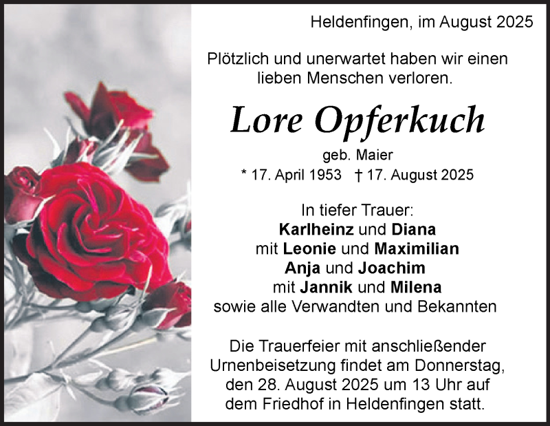 Hier finden Sie alle Traueranzeigen aus der Zeitung, die bisher für Lore Opferkuch erschienen sind. Weitere Traueranzeigen, die in der Zeitung erscheinen, werden hier ebenfalls aufgelistet