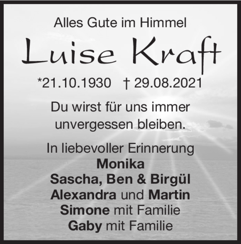 Hier finden Sie alle Traueranzeigen aus der Zeitung, die bisher für Luise Kraft erschienen sind. Weitere Traueranzeigen, die in der Zeitung erscheinen, werden hier ebenfalls aufgelistet