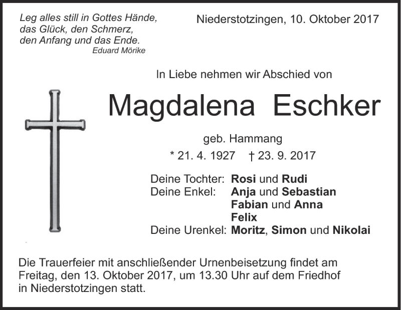 Hier finden Sie alle Traueranzeigen aus der Zeitung, die bisher für Magdalena Eschker erschienen sind. Weitere Traueranzeigen, die in der Zeitung erscheinen, werden hier ebenfalls aufgelistet