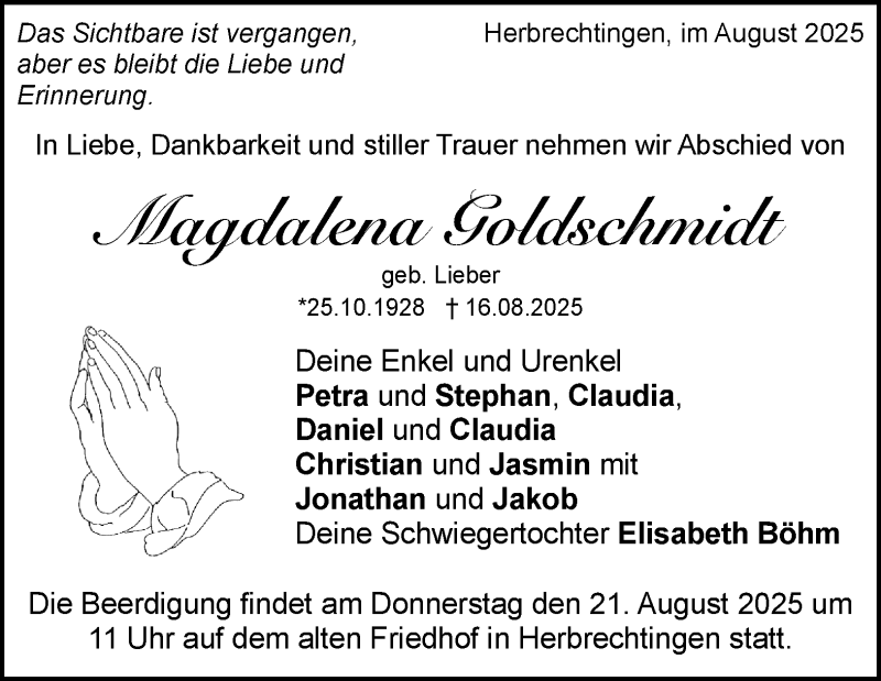 Hier finden Sie alle Traueranzeigen aus der Zeitung, die bisher für Magdalena Goldschmidt erschienen sind. Weitere Traueranzeigen, die in der Zeitung erscheinen, werden hier ebenfalls aufgelistet