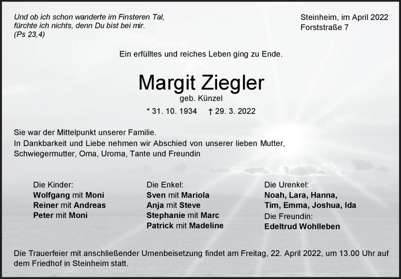 Hier finden Sie alle Traueranzeigen aus der Zeitung, die bisher für Margit Ziegler erschienen sind. Weitere Traueranzeigen, die in der Zeitung erscheinen, werden hier ebenfalls aufgelistet