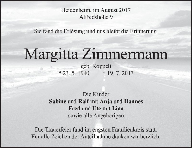 Hier finden Sie alle Traueranzeigen aus der Zeitung, die bisher für Margitta Zimmermann erschienen sind. Weitere Traueranzeigen, die in der Zeitung erscheinen, werden hier ebenfalls aufgelistet