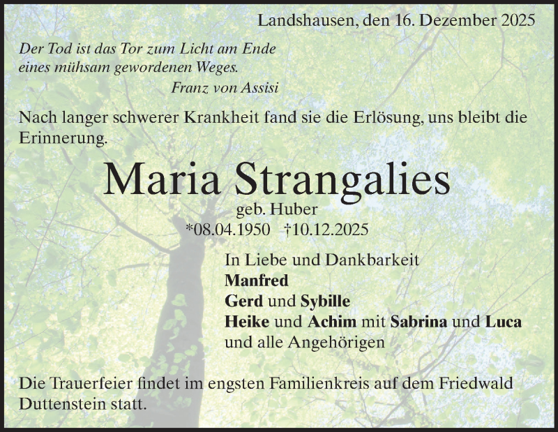 Hier finden Sie alle Traueranzeigen aus der Zeitung, die bisher für Maria Strangalies erschienen sind. Weitere Traueranzeigen, die in der Zeitung erscheinen, werden hier ebenfalls aufgelistet