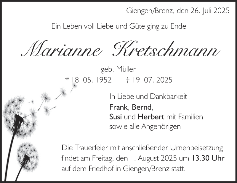 Hier finden Sie alle Traueranzeigen aus der Zeitung, die bisher für Marianne Kretschmann erschienen sind. Weitere Traueranzeigen, die in der Zeitung erscheinen, werden hier ebenfalls aufgelistet