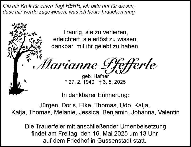 Hier finden Sie alle Traueranzeigen aus der Zeitung, die bisher für Marianne Pfefferle erschienen sind. Weitere Traueranzeigen, die in der Zeitung erscheinen, werden hier ebenfalls aufgelistet