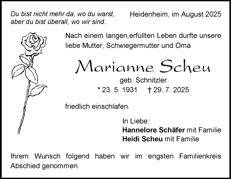 Hier finden Sie alle Traueranzeigen aus der Zeitung, die bisher für Marianne Scheu erschienen sind. Weitere Traueranzeigen, die in der Zeitung erscheinen, werden hier ebenfalls aufgelistet