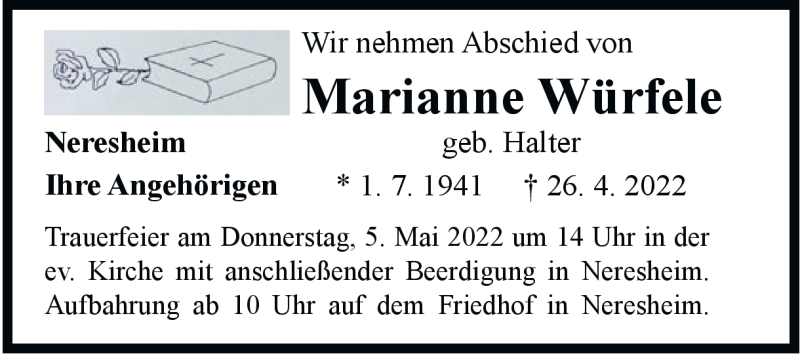 Hier finden Sie alle Traueranzeigen aus der Zeitung, die bisher für Marianne Würfele erschienen sind. Weitere Traueranzeigen, die in der Zeitung erscheinen, werden hier ebenfalls aufgelistet