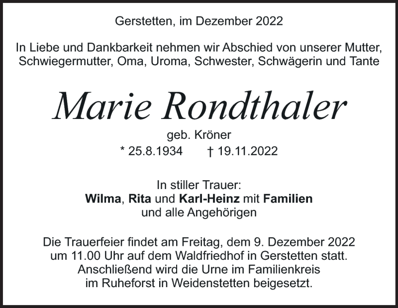 Hier finden Sie alle Traueranzeigen aus der Zeitung, die bisher für Marie Rondthaler erschienen sind. Weitere Traueranzeigen, die in der Zeitung erscheinen, werden hier ebenfalls aufgelistet