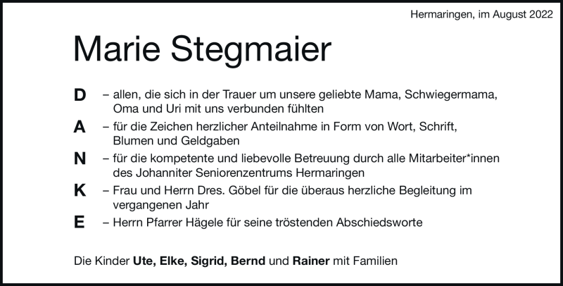 Hier finden Sie alle Traueranzeigen aus der Zeitung, die bisher für Marie Stegmaier erschienen sind. Weitere Traueranzeigen, die in der Zeitung erscheinen, werden hier ebenfalls aufgelistet