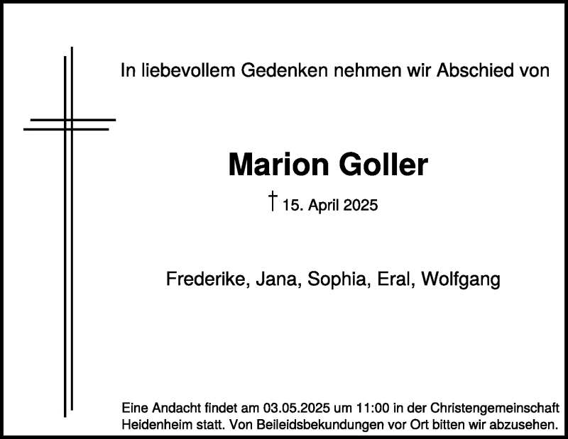 Hier finden Sie alle Traueranzeigen aus der Zeitung, die bisher für Marion Goller erschienen sind. Weitere Traueranzeigen, die in der Zeitung erscheinen, werden hier ebenfalls aufgelistet