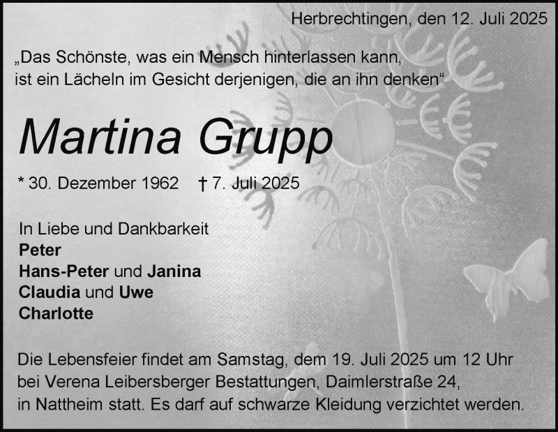 Hier finden Sie alle Traueranzeigen aus der Zeitung, die bisher für Martina Grupp erschienen sind. Weitere Traueranzeigen, die in der Zeitung erscheinen, werden hier ebenfalls aufgelistet