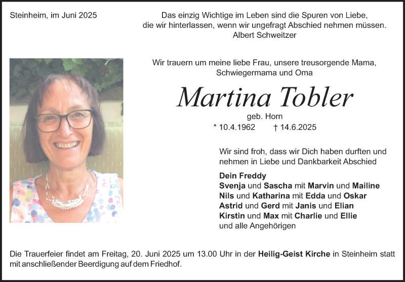Hier finden Sie alle Traueranzeigen aus der Zeitung, die bisher für Martina Tobler erschienen sind. Weitere Traueranzeigen, die in der Zeitung erscheinen, werden hier ebenfalls aufgelistet
