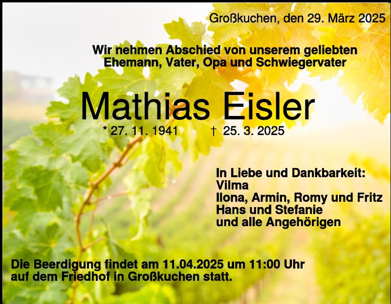 Hier finden Sie alle Traueranzeigen aus der Zeitung, die bisher für Mathias Eisler erschienen sind. Weitere Traueranzeigen, die in der Zeitung erscheinen, werden hier ebenfalls aufgelistet