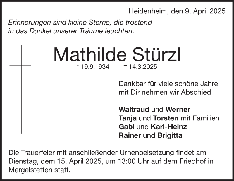 Hier finden Sie alle Traueranzeigen aus der Zeitung, die bisher für Mathilde Stürzl erschienen sind. Weitere Traueranzeigen, die in der Zeitung erscheinen, werden hier ebenfalls aufgelistet