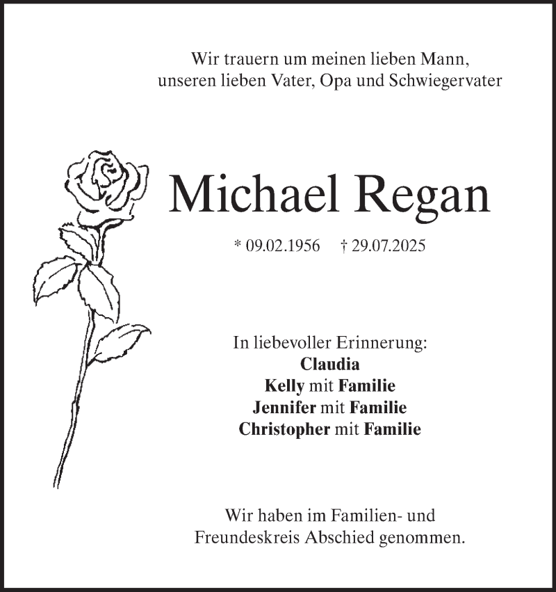 Hier finden Sie alle Traueranzeigen aus der Zeitung, die bisher für Michael Regan erschienen sind. Weitere Traueranzeigen, die in der Zeitung erscheinen, werden hier ebenfalls aufgelistet
