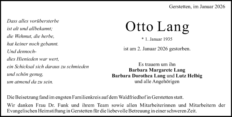 Hier finden Sie alle Traueranzeigen aus der Zeitung, die bisher für Otto Lang erschienen sind. Weitere Traueranzeigen, die in der Zeitung erscheinen, werden hier ebenfalls aufgelistet