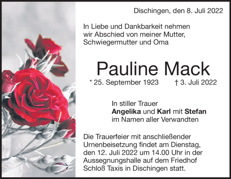 Hier finden Sie alle Traueranzeigen aus der Zeitung, die bisher für Pauline Mack erschienen sind. Weitere Traueranzeigen, die in der Zeitung erscheinen, werden hier ebenfalls aufgelistet