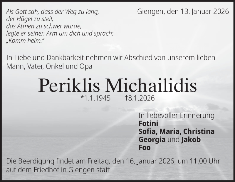 Hier finden Sie alle Traueranzeigen aus der Zeitung, die bisher für Periklis Michailidis erschienen sind. Weitere Traueranzeigen, die in der Zeitung erscheinen, werden hier ebenfalls aufgelistet